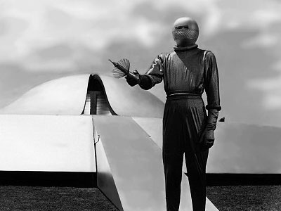 feet above the ground and in classic "Day the Earth Stood Still" flying saucer fashion, a